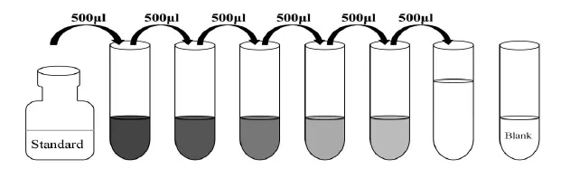 倍比稀释方法:取7支 EP管,每管中加入500μL通用稀释液,200ng/mL的标准品工作液中吸取500μL到第一支EP管中混匀配成100ng/mL的标准品工作液,按此步骤往后依次吸取混匀。最后一管直接作为空白孔,不需要再从倒数第二管中吸取液体,具体如下图。